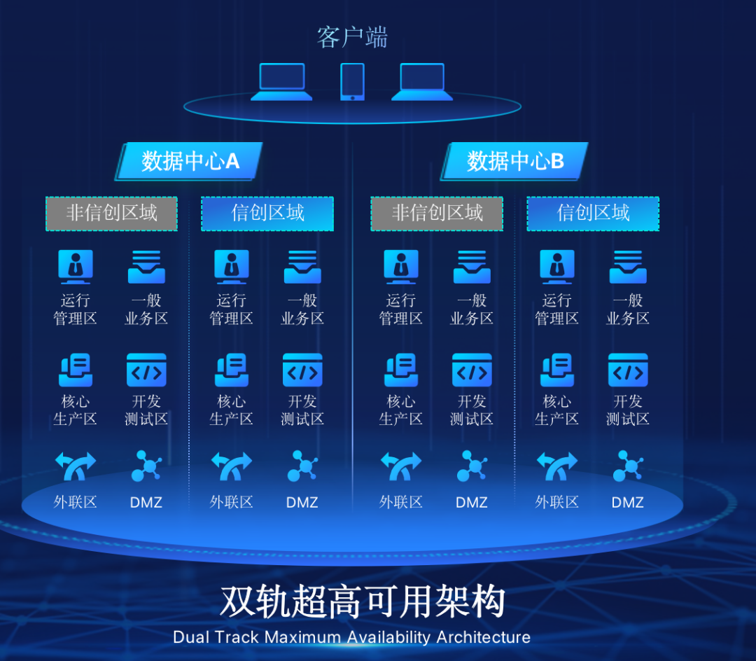 AG庄闲游戏在企业面临自主创新IT基础重构过程中,推出的全新架构双轨超高可用架构(简称DTMAA),在双活数据中心的分区调度基础上,添加每个数据中心内信创域和非信创域的分域调度,来实现分区分域协同的多活双轨超高可用。